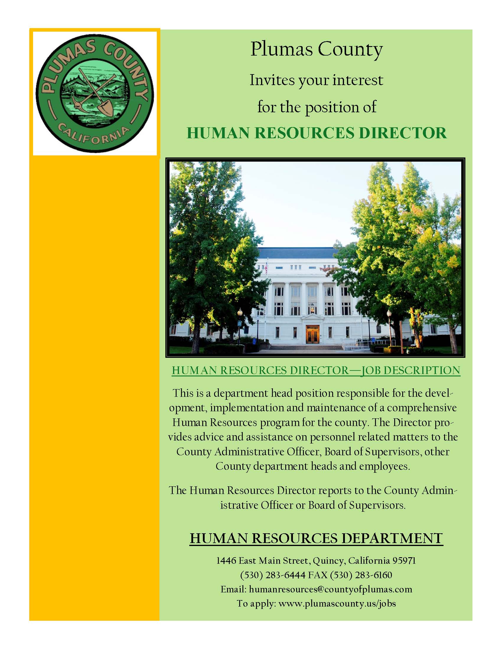 • Directs the County Human Resources programs, including recruitment, testing, classification, compensation, the County’s self-funded health plan, benefits, affirmative action/equal employment opportunity, and training.